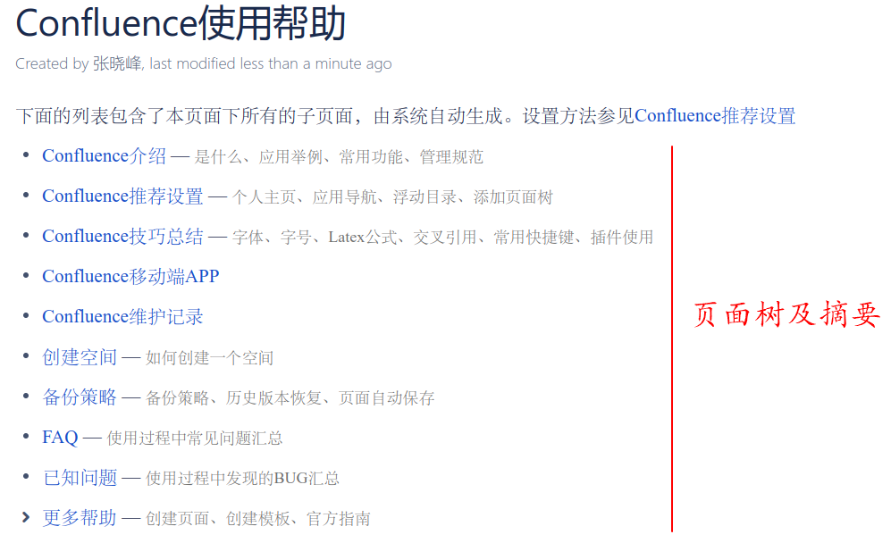 页面树里,各子页面名称右边“—”后面的内容是页面的摘要,添加方法:Insert more content → More macro,在弹出窗口中搜索"Excerpt",点击确定即可添加摘要。用户可以选择隐藏摘要,这样的话摘要只在页面树结构中出现,不在页面中显示。关于子页面树的生成方式及详细配置,请参阅Page Tree Macro.