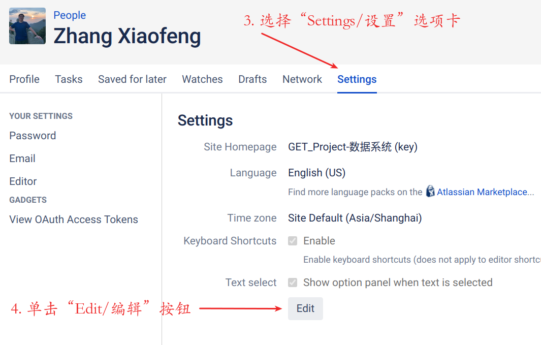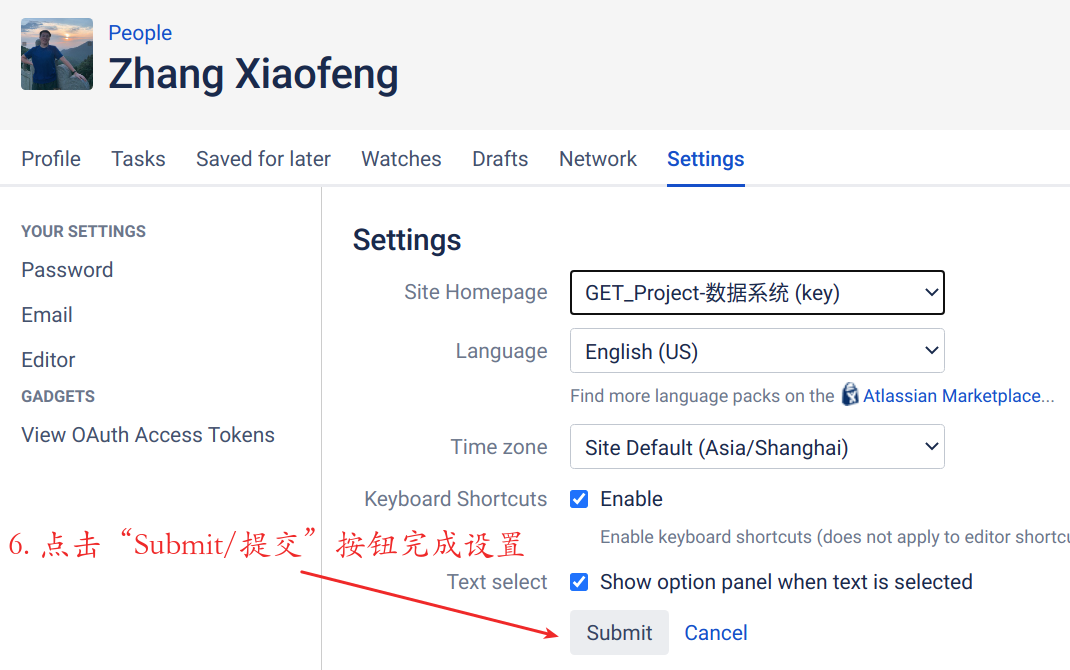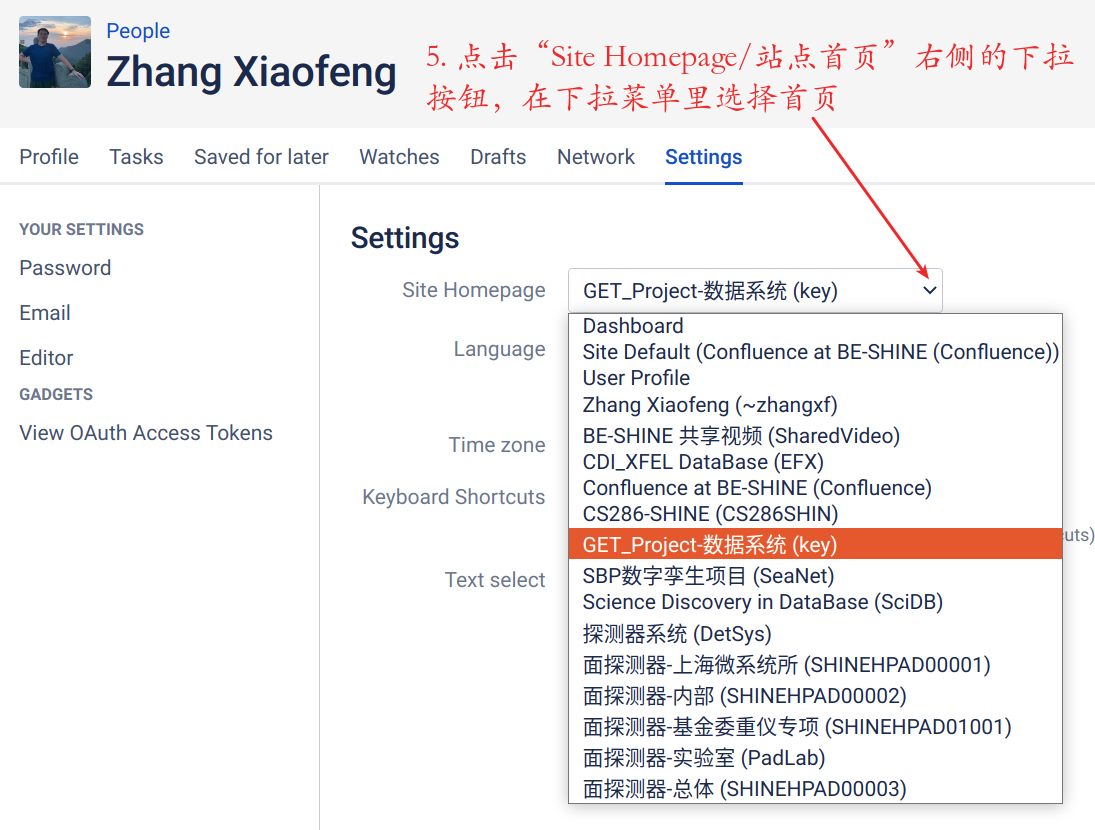 | 5 | 点击“Site Homepage/站点首页”右侧的下拉 按钮,在下拉菜单里选择空间名称 | |