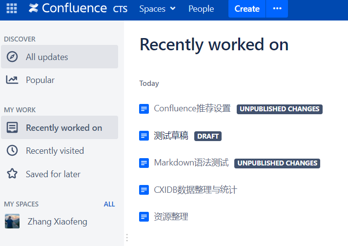 步骤与“设置成感兴趣的空间”相似,不同之处是在第5步在下拉菜单里选择"Dashboard",这样每次登录Confluence或者点击左上角的"Confluence CTS"可以直接跳转到自己的Dashboard页面,该页面上会按顺序显示你最近编辑过的页面,更重要的是会列出编辑后未发布的页面(UNPUBLISHED CHANGES)以及新建却未发布的页面(DRFAT),如下图所示,当然,也可以单击右上角个人头像,选择"Recently worked on"打开这个页面。