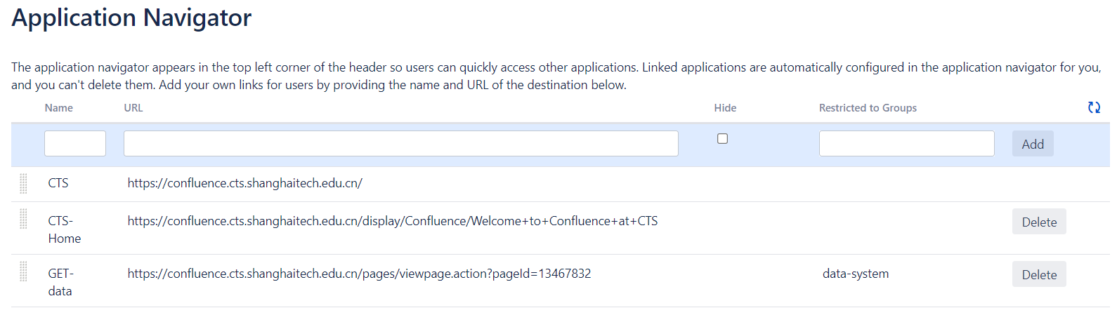 定义应用导航需要管理员权限,定义过程如下图所示。用户需要提供Name,URL和需要限定的群组等信息,如果不限定群组,则默认对包含匿名用户在内的所有用户可见。用户可以发邮件至yinyr@shanghaitech.edu.cn或者zhangxf2@shangshaitech.edu.cn请求创建新的导航,也可以直接在本页面评论区提出请求(管理员不一定能及时看到)。